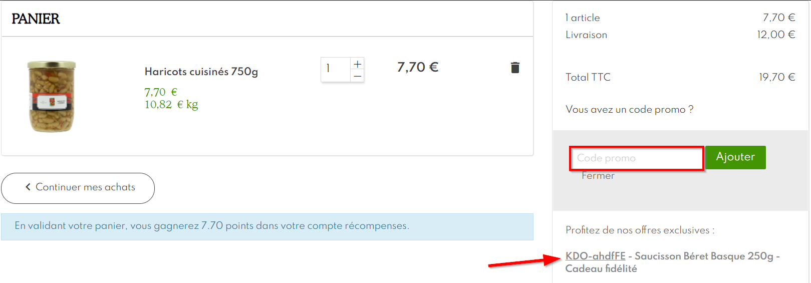 4 - Si le cadeau n'est pas déjà dans votre panier vous pouvez l'ajouter en renseignant le code promo.